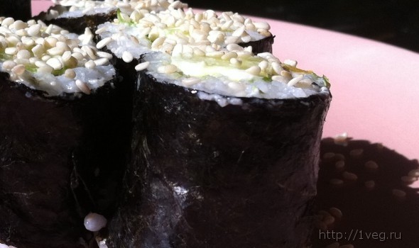Уже готовые кусочки роллов выкладываем на тарелку и присыпаем кунжутным семенем. Ваши вегетарианские роллы готовы!