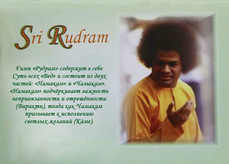 Саи Рам! Сегодня получила очень замечательное предложение от Александры Коптеловой об изучении и совместном воспевании рудр в Москве. То, что она предлагает, написано ниже. От себя хочу добавить, что это было бы прекрасной возможностью собираться раз в неделю ради того негласного завещания, которое оставил Свами за 2 года до Махасамадхи. Ведь не случайно же с 2009-го года чтение Рудрама стало широким достоянием для всех прибывающих в Пршанти, где каждый мог купить книжечку с текстом и дважды в день принимать участие в чтении Рудрама в мандире. Мне кажется, намёк с Его стороны более, чем прозрачный, и нам стоит создавать небольшие (и большие тоже)) группы, чтобы очищать, насыщать и освящать пространство космическими ведическими вибрациями.