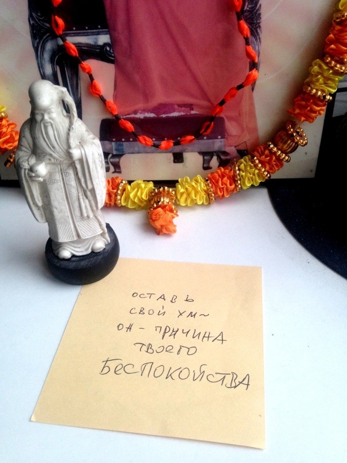 Но нашлась она сегодня в Москве. Меня беспокоила ситуация с одним человеком, и я не могла долго спать. Проснулась рано, умылась, выполнила все ритуалы... Стала молиться Свами о ситуации. И мне показалось, что портрет стоит ненадёжно, что он может упасть. Стала поправлять его, за ним оказалась записка. В ней было написано: "Оставь свой ум - он причина твоего беспокойства".